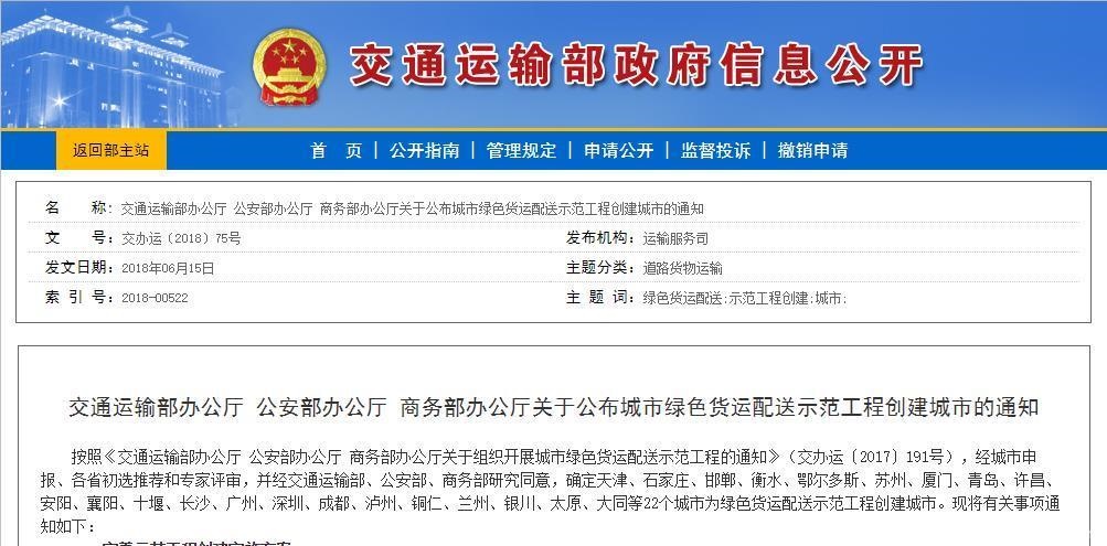 6月(yuè)15日(rì),交通(tōng)部、公安部、商務部發布《關于組織γ♠¥開(kāi)展城(chéng)市(shì)綠∏φ'(lǜ)色貨運配送示範工(gōng)程的(de)通( ©∞tōng)知(zhī)》。通(tōng)知(zhī)指出,經城(chéng)市φ←<(shì)申報(bào)、各省初選推薦和(hé₹λ)專家(jiā)評審,并經交通(tōng)運輸>≥Ω部、公安部、商務部研究同意,确定天津、石家≈♣α(jiā)莊、邯鄲、衡水(shuǐ)、鄂爾多(duō)斯、蘇州、廈♥✘ ↔門(mén)、青島、許昌、安陽、襄陽、十堰、長(c<™háng)沙、廣州、深圳、成都(dōu)、泸州、銅仁、蘭州、銀(yí×≤$£n)川、太原、大(dà)同等22個(gè)城(chéng)市ββ(shì)為(wèi)綠(lǜ)色貨運配送示範工(gōng)程創建城(c¥§ héng)市(shì)。